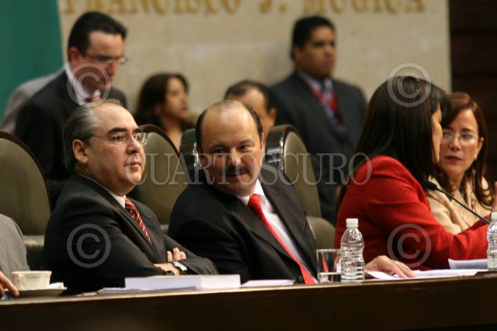 MÉXICO D.F., 25SEPTIEMBRE2008.-Se llevo acabo la sesión solemne en la Cámara de Diputados, donde se develaron con letras de oro en el muro de honor “A las Constituyentes de 1857” esto durante la sesión. En la imagen los diputados, José Luis Espinoza y Hector Larios. FOTO: GUILLERMO PEREA/CUARTOSCURO.COM