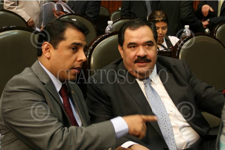 MÉXICO D.F., 25SEPTIEMBRE2008.-Se llevo acabo la sesión solemne en la Cámara de Diputados, donde se develaron con letras de oro en el muro de honor “A las Constituyentes de 1857” esto durante la sesión. en la imagen los diputados del PAN, Diodoro Carrasco y Hector Larios. FOTO: GUILLERMO PEREA/CUARTOSCURO.COM
