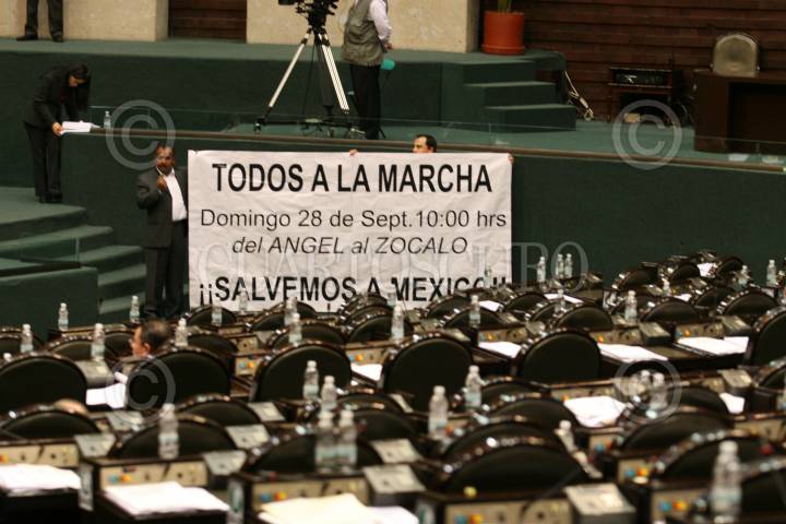 MÉXICO D.F., 25SEPTIEMBRE2008.-Se llevo acabo la sesión solemne en la Cámara de Diputados, donde se develaron con letras de oro en el muro de honor “A las Constituyentes de 1857” esto durante la sesión. En la imagen diputados del PRD, mustran una manta con la leyenda " Todos a la Marcha domingo 28 de Sept. 10:00 hrs. del Ángel de la Independencia al Zócalo ¡¡Salvemos a México!!. FOTO: GUILLERMO PEREA/CUARTOSCURO.COM