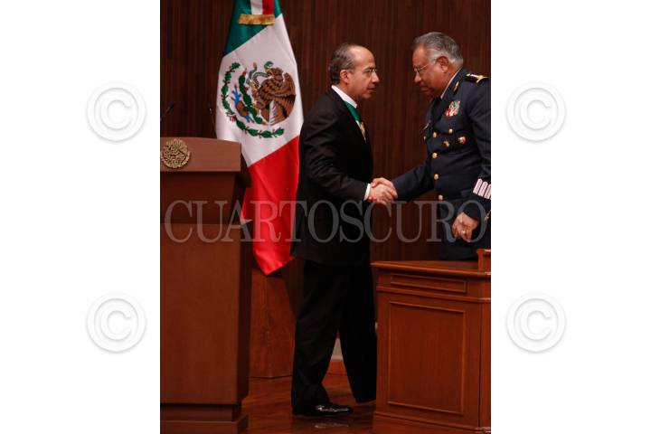 QUERÉTARO, QUERÉTARO, 05FEBRERO2010.- Felipe Calderón, Presidente de México y Guillermo Galvàn, Secretario de la Sedena, durante la celebración del Aniversario XCIII de la Constituciòn Mexicana, realizad en el Teatro de la República. FOTO: CUARTOSCURO.COM