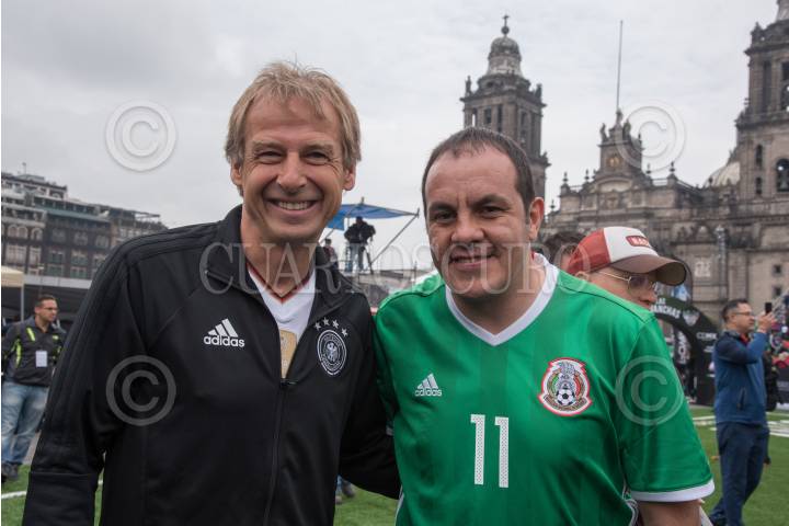 CIUDAD DE MÉXICO, 09JULIO2017.- Jugadores de México y Alemania que conformaron las selecciones de futbol de 1986 y 1998 respectivamente, disputaron el Partido “Las Revanchas” celebrado en la plancha del Zócalo Capitalino. El partido estuvo comprendido por dos partidos, en donde el equipo teutón se llevó la victoria en el primero con un marcador de 3-1, y el equipo azteca triunfó en el segundo con un marcador a favor de 2-0, declarándose así, un empate en todo el partido. En la imagen el alemán Jürgen Klinsmann y el mexicano Cuauhtémoc Blanco. FOTO: MARIO JASSO /CUARTOSCURO.COM