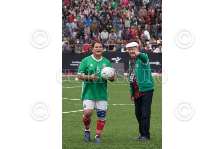 CIUDAD DE MÉXICO, 09JULIO2017.- Jugadores de México y Alemania que conformaron las selecciones de futbol de 1986 y 1998 respectivamente, disputaron el Partido “Las Revanchas” celebrado en la plancha del Zócalo Capitalino. El partido estuvo comprendido por dos partidos, en donde el equipo teutón se llevó la victoria en el primero con un marcador de 3-1, y el equipo azteca triunfó en el segundo con un marcador a favor de 2-0, declarándose así, un empate en todo el partido. En la imagen "El abuelo Cruz" y el entrenador Manuel Lapuente. FOTO: MARIO JASSO /CUARTOSCURO.COM