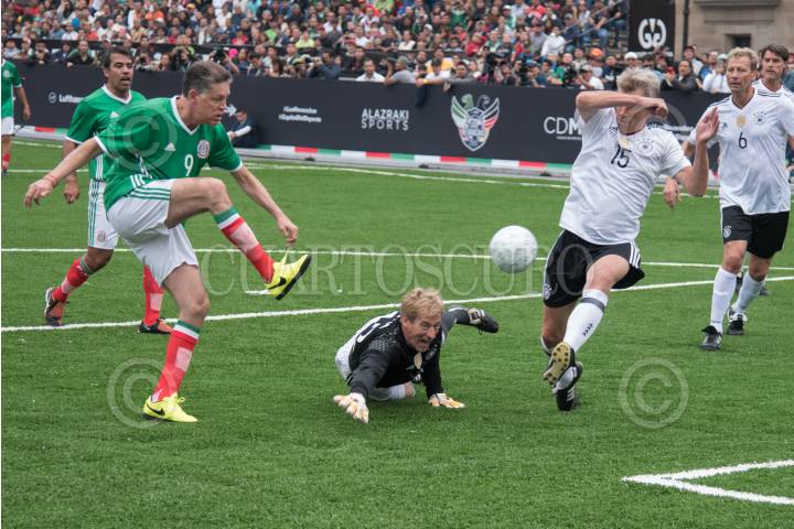 CIUDAD DE MÉXICO, 09JULIO2017.- Jugadores de México y Alemania que conformaron las selecciones de futbol de 1986 y 1998 respectivamente, disputaron el Partido “Las Revanchas” celebrado en la plancha del Zócalo Capitalino. El partido estuvo comprendido por dos partidos, en donde el equipo teutón se llevó la victoria en el primero con un marcador de 3-1, y el equipo azteca triunfó en el segundo con un marcador a favor de 2-0, declarándose así, un empate en todo el partido. En la imagen Ricardo Peláez intenta marcar en la portería alemana. FOTO: MARIO JASSO /CUARTOSCURO.COM