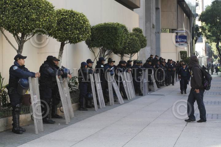 MÉXICO, D.F., 01DICIEMBRE2013.- Elementos de la policía Metropolitana, resguardaron los principales hoteles y negocios sobre la avenida Reforma y Juárez donde pasara una marcha de distintos contingentes de maestros, estudiantes y asociaciones civiles en aniversario al primer año de gestiones del presidente Enrique Peña Nieto. FOTO: ENRIQUE ORDÓÑEZ /CUARTOSCURO.COM