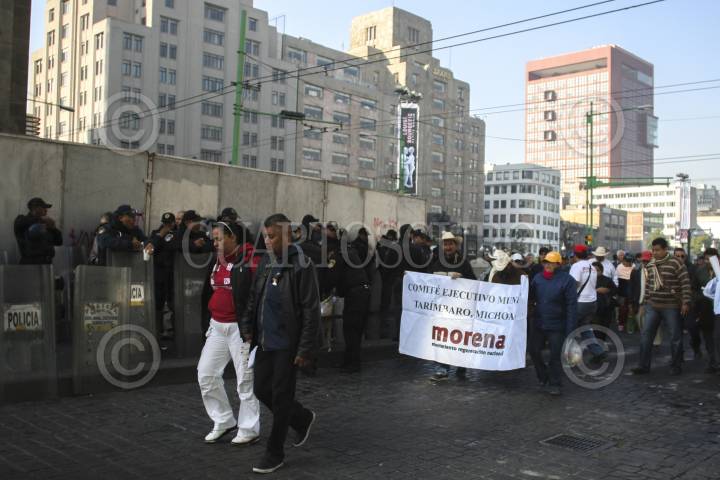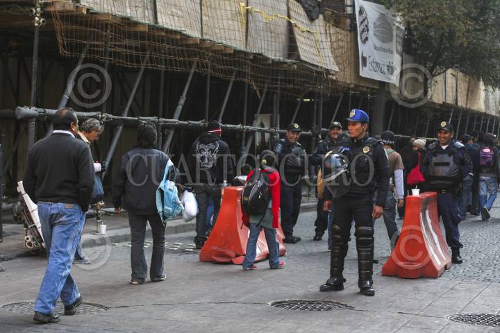 MÉXICO, D.F., 01DICIEMBRE2013.- Manifestantes pertenecientes al Movimiento de Regeneración Nacional comenzaron a arribar al Zócalo Capitalino donde realizara un mitin de Andrés Manuel López Obrador. En el lugar elementos de la Policía Metropolitana resguardan la zona para impedir que estudiantes y Maestros arriben al lugar. FOTO: ENRIQUE ORDÓÑEZ /CUARTOSCURO.COM