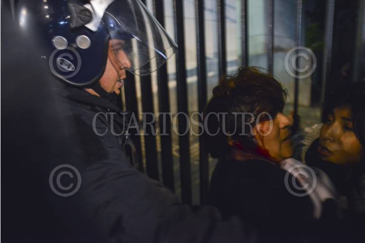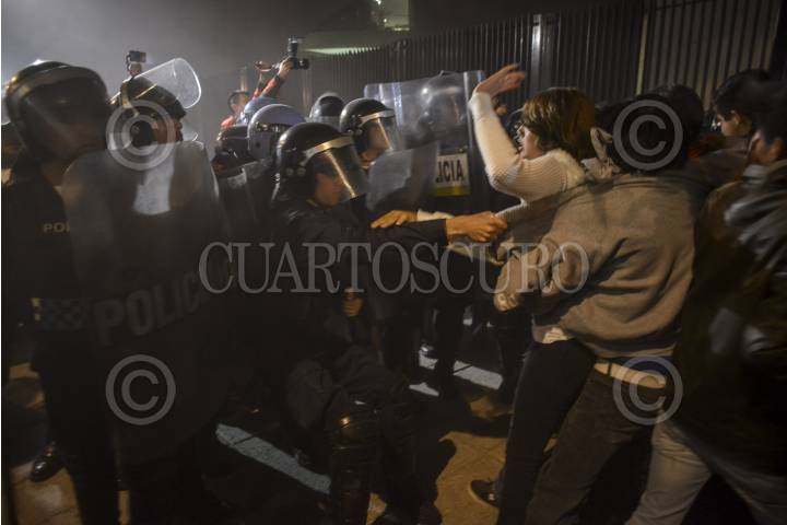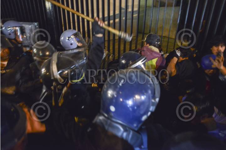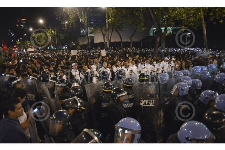 MÉXICO D.F., 01DICIEMBRE2014.- De la plancha del Zócalo al Ángel de la Independencia miles de personas, de diferentes organizaciones sociales, estudiantiles y políticas, acompañaron a familiares de los 43 estudiantes normalistas desaparecidos de Ayotzinapa, en la marcha por la aparición con vida de los jóvenes. Al termino del mitin la policía capitalina, en búsqueda de un grupo de jóvenes que atacaron bancos, encapsularon a manifestantes a la altura del Senado, golpearon a personas e intentaron detener a manifestantes. FOTO: ADOLFO VLADIMIR /CUARTOSCURO.COM