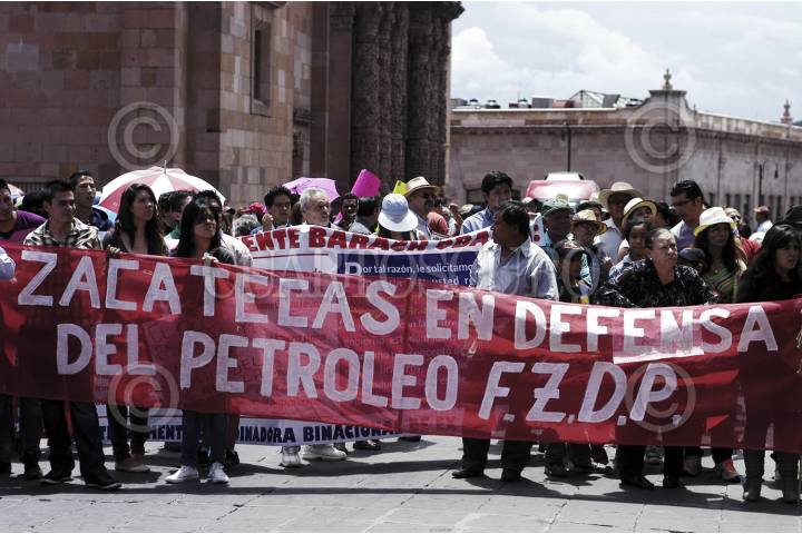 ZACATECAS, ZACATECAS, 1SEPTIEMBRE2013.- Integrantes del movimiento #132 y exbraceros realizaron una marcha en contra de la reforma energética y en múltiples pancartas exigían: “PEMEX no se vende se defiende". FOTO: EDGAR CHÁVEZ /CUARTOSCURO.COM