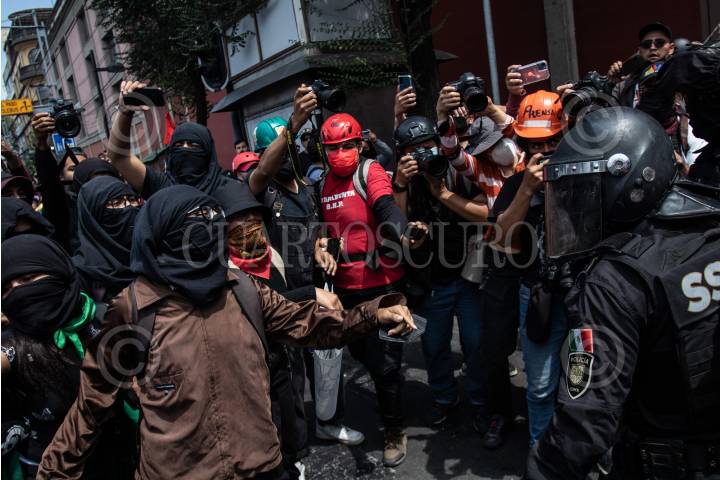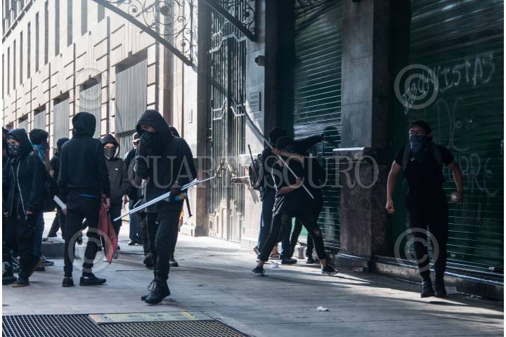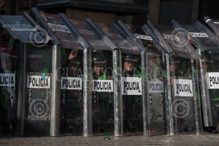 MÉXICO, 02OCTUBRE2019.- Miles de estudiantes, normales rurales, organizaciones sociales, campesinos, colectivos anarquistas, comité 68 y de los 43 estudiantes desaparecidos de Ayotzinapa, marcharon de diferentes salidas hacía el Zócalo Capitalino, entre el cinturón de la paz los cuales pretendían evitar que los contingentes de jóvenes anarquistas realizaran destrozos a su paso, esto por el aniversario 51 del ataque estudiantil en Tlatelolco. FOTO: ANDREA MURCIA /CUARTOSCURO.COM