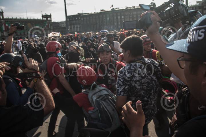 CIUDAD DE MÉXICO, 02OCTUBRE2019.- Luego de que a su paso el contingente de jóvenes anarquistas, agredieran a reporteros y reporteras, estos se enfrentaron contra ellos durante el mitín del Comité del 68 en conmemoración a los 51 años del ataque a los estudiantes en Tlatelolco. Miembros de el colectivo Marabunta detuvieron a los reporteros evitando la confrontación. FOTO: ANDREA MURCIA /CUARTOSCURO.COM