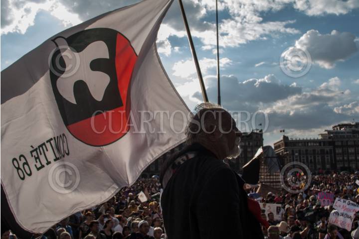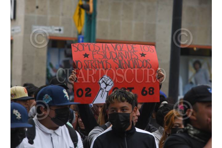Miles de personas marcharon desde la Plaza de las Tres culturas rumbo al Zócalo Capitalino en conmemoración del movimiento estudiantil del 68 y por los estudiantes asesinados el 2 de octubre del mismo año.