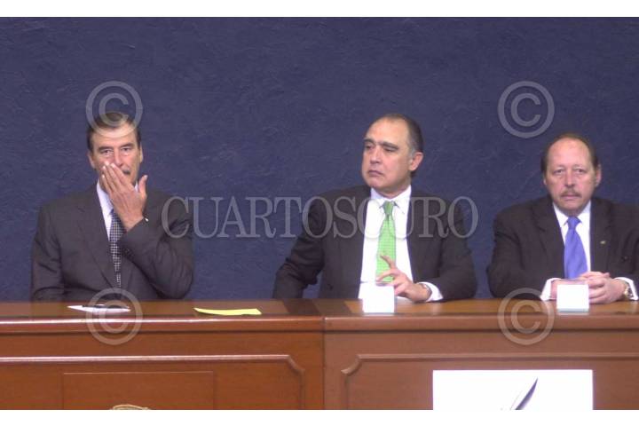 México D.F 18FEB2004.- El presidente Vicente Fox, Fernando Canales Clarion, secretario de Economía y León Halkim, presidente de la Concamin, durante la entrega del Premio Innovación de la Administración Pública 2003. FOTO: Eunice Adorno/CUARTOSCURO.COM