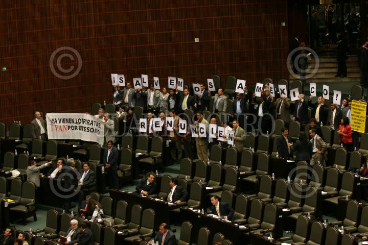 MÉXICO D.F. 23SEPTIEMBRE2008.- Diputados del PRD, muestran un letrero con la leyenda “Salvemos México Renuncien” y una manta “Hay Vienen los Piratas I Van por el Tesoro” esto durante la comparecencia de Juan Camilo Muriño titular de la secretaria de Gobernación, acompañado de Eduardo Medina Mora Procurador General de Justicia y de Genaro García Luna titular de la Secretaria de Seguridad Pública Federal, en la Cámara de Diputados. FOTO: GUILLERMO PEREA/CUARTOSCURO.COM