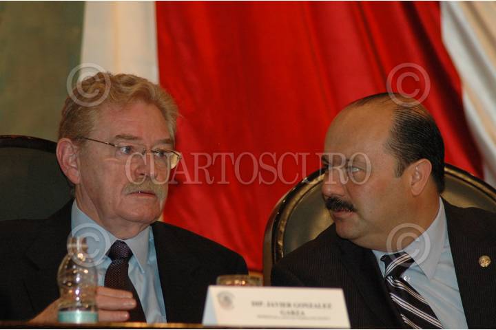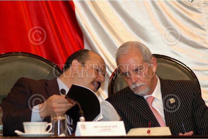 MÉXICO, D.F., 12MARZO2009.- Cesar Duarte, presidente de la mesa directiva conversa con el contador Arturo Gonzalez de Aragón auditor superior de la Federación, durante la entrega del informe del resultado de la revisión y fiscalización superior de la cuenta pública 2007 que se realizo en el salón legisladores de la Cámara de Diputados. FOTO: RODOLFO ANGULO/CUARTOSCURO.COM