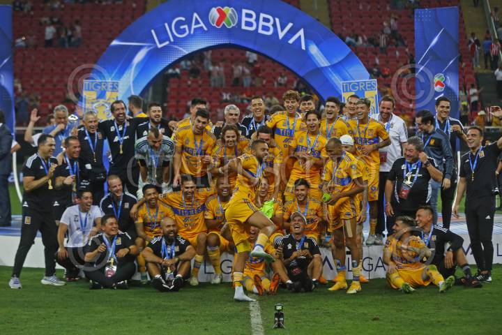 Jugadores de Tigres celebran el campeonato, esto tras ganar el partido correspondiente a la final del Torneo Clausura Temporada 2022-2023 de la Liga MX.