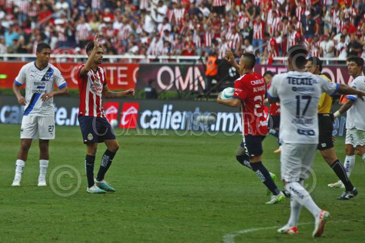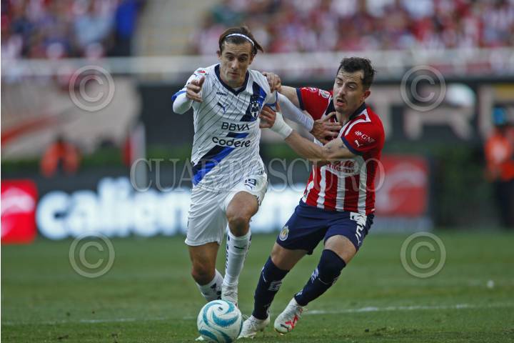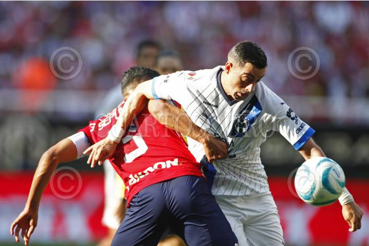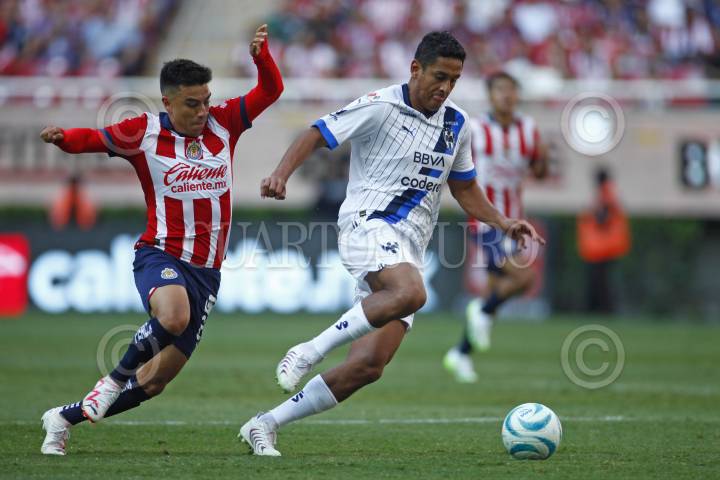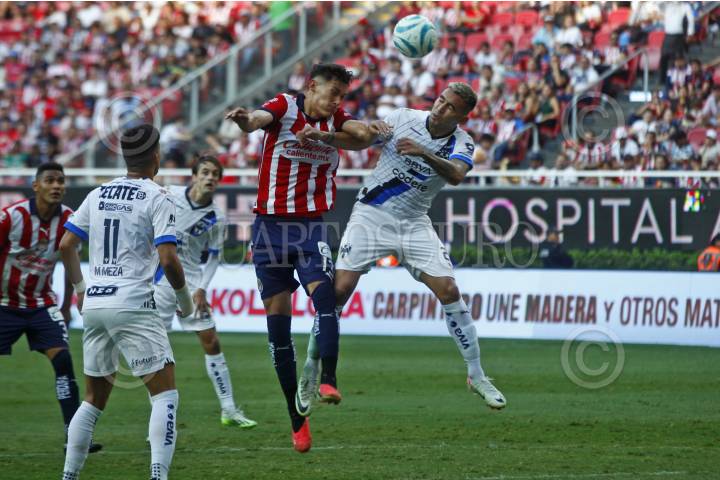 Jesús Orozco jugador de Chivas disputa el balón con los contrario de Monterrey, Sebastián Vegas, esto en partido correspondiente a jornada 7 del Torneo Apertura Temporada 2022-2023 de la Liga MX.