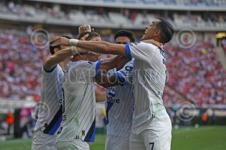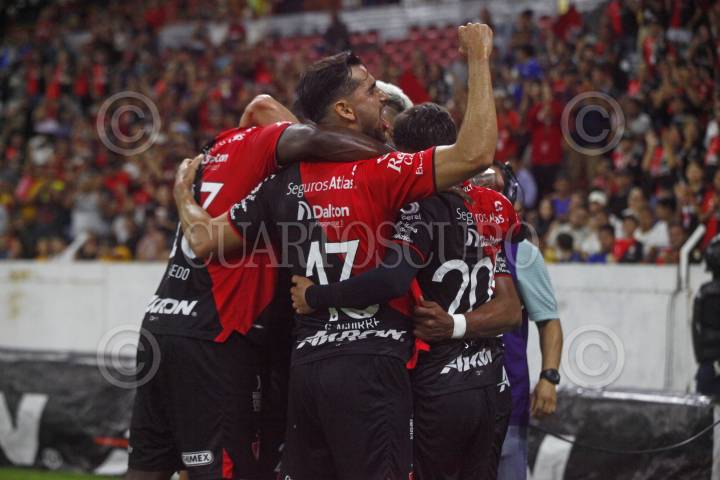 GUADALAJARA, JALISCO, 17SEPTIEMBRE2023.- Jugadores de Atlas celebran la anotación de Juan Zapata, esto en partido correspondiente a la Jornada 8 del Torneo Apertura Temporada 2022-2023 de la Liga MX, en donde se enfrentan el equipo de Atlas y los Tigres de la UANL en el Estadio Jalisco, el marcador al final es de 2-0, a favor del equipo local. FOTO: FERNANDO CARRANZA GARCIA / CUARTOSCURO.COM