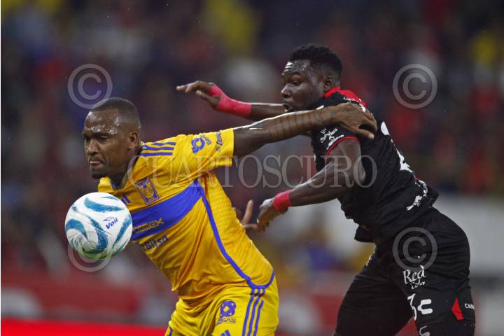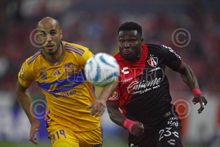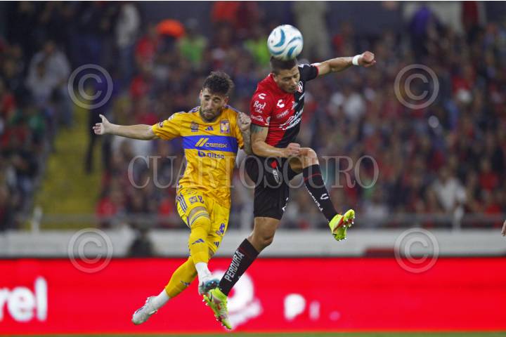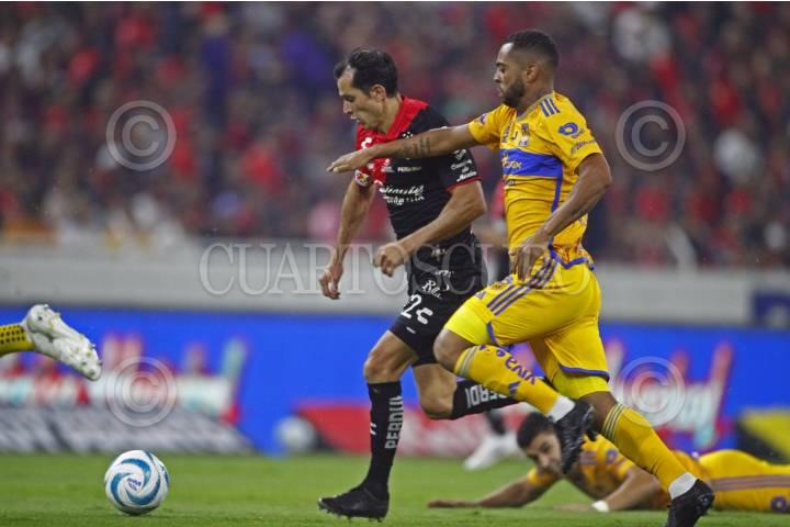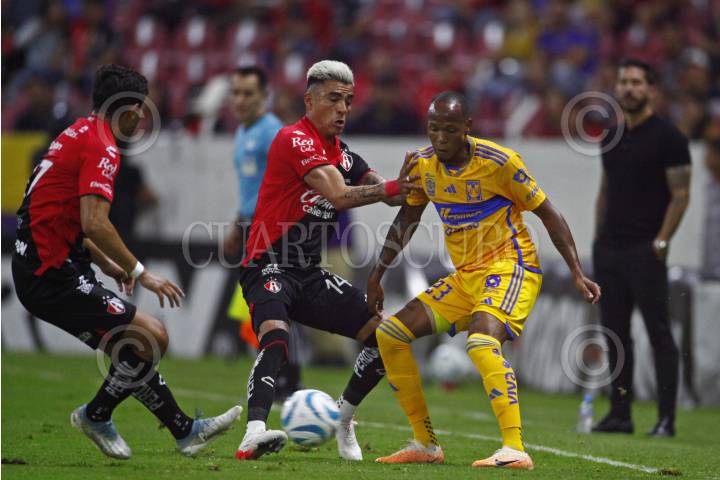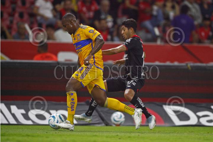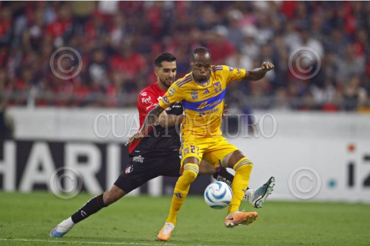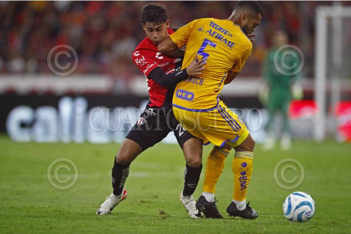 GUADALAJARA, JALISCO, 17SEPTIEMBRE2023.- El Jugador de Tigres, Luis Quiñonez, disputa un balón con el contrario de Atlas, Gaddi Aguirre, esto en partido correspondiente a la Jornada 8 del Torneo Apertura Temporada 2022-2023 de la Liga MX, en donde se enfrentan el equipo de Atlas y los Tigres de la UANL en el Estadio Jalisco, el marcador al final es de 2-0, a favor del equipo local. FOTO: FERNANDO CARRANZA GARCIA / CUARTOSCURO.COM