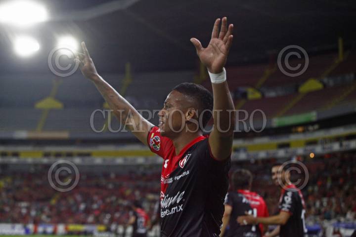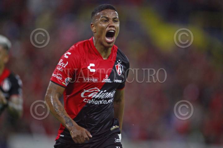 GUADALAJARA, JALISCO, 17SEPTIEMBRE2023.- El Jugador de Atlas, Juan Zapata, celebra su anotación, esto en partido correspondiente a la Jornada 8 del Torneo Apertura Temporada 2022-2023 de la Liga MX, en donde se enfrentan el equipo de Atlas y los Tigres de la UANL en el Estadio Jalisco, el marcador al final es de 2-0, a favor del equipo local. FOTO: FERNANDO CARRANZA GARCIA / CUARTOSCURO.COM
