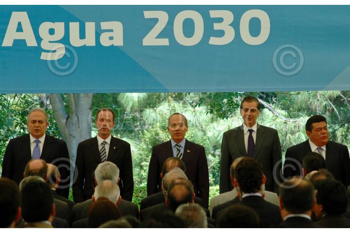 MÉXICO, D.F., 26MARZO2010.- José Guadalupe Osuna Millán, gobernador de Baja California; José Luis Luege Tamargo, director de Conagua; el presidente Felipe Calderón, Juan Rafael Elvira Quesada, secretario del Medio Ambiente y Fernando Ortega Bernés gobernador de Campeche durante la presentación de la Agenda del Agua 2030 que se realizo en la Explanada del Monumento a Francisco I. Madero de la residencia oficial de Los Pinos. FOTO: RODOLFO ANGULO/CUARTOSCURO.COM