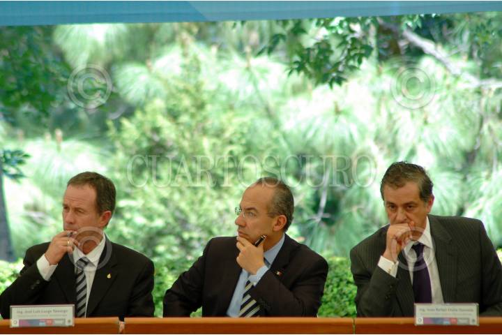 MÉXICO, D.F., 26MARZO2010.- José Luis Luege Tamargo, director de Conagua, el presidente Felipe Calderón y Juan Rafael Elvira Quesada, secretario del Medio Ambiente durante la presentación de la Agenda del Agua 2030 que se realizo en la Explanada del Monumento a Francisco I. Madero de la residencia oficial de Los Pinos. FOTO: RODOLFO ANGULO/CUARTOSCURO.COM
