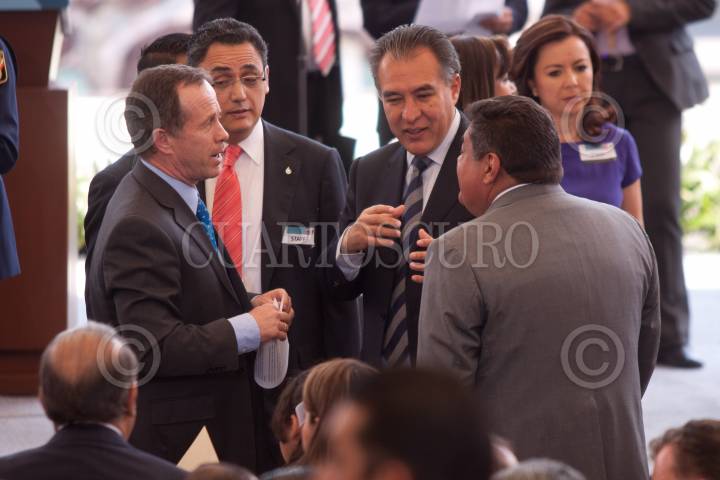 MÉXICO, D.F., 26MARZO2010.- Marco Antonio Adame Castillo, gobernador de Morelos; Guillermo Padrés Elías, gobernador de Sonora; Héctor Ortiz Ortiz, gobernador de Tlaxcala; Francisco Javier Mayorga, secretario de Agricultura y José Ángel Cordoba Villalobos, secretario de Salud durante la presentación de la Agenda del Agua 2030 que se realizo en la Explanada del Monumento a Francisco I. Madero de la residencia oficial de Los Pinos. FOTO: RODOLFO ANGULO/CUARTOSCURO.COM