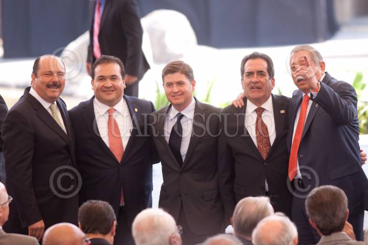 MÉXICO, D.F., 23MARZO2011.- César Horacio Duarte Jáquez, gobernador de Chihuahua; Javier Duarte de Ochoa, gobernador de Veracruz; Rodrigo Medina de la Cruz, gobernador de Nuevo León; Carlos Lozano de la Torre, Aguascalientes; y Egidio Torre Cantú; gobernador de Tamaulipas; acudieron al Cárcamo de Dolores ubicado en la segunda sección del Bosque de Chapultepec a presenciar el Acuerdo por el Agua 2030. FOTO: IVÁN STEPHENS/CUARTOSCURO.COM