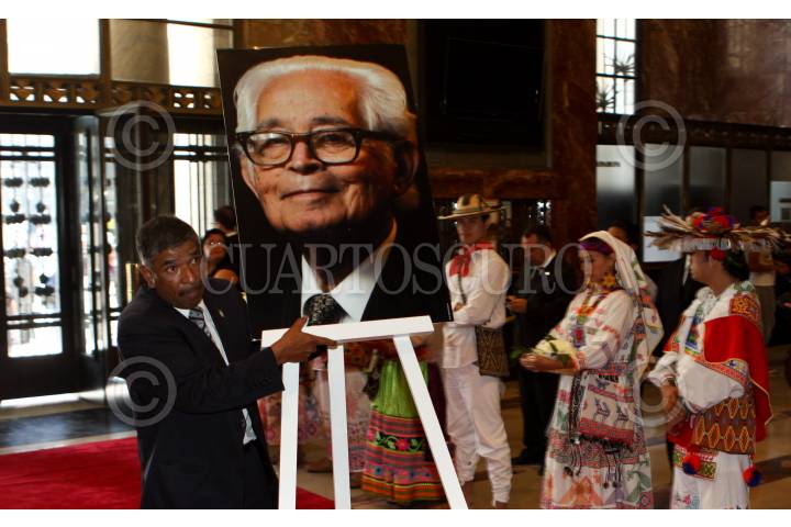 MÉXICO, D.F., 24OCTUBRE2010.- Una persona carga una fotografía del poeta y escritor Alí Chumacero durante un homenaje de cuerpo presente que se le realizo al poeta en el Palacio de Bellas Artes luego de que falleciera el día viernes a las 22:15 horas a los 92 años a causa de una pulmonía. FOTO: RODOLFO ANGULO/CUARTOSCURO.COM