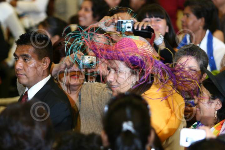 MÉXICO D.F., 12AGOSTO2008.-Una mujer boliviana saca su bandera previo al 3.er encuentro internacional de empresarias sociales del fondo nacional de apoyos a empresas en solidaridad 2008, realizado en el salon valparaiso del centro Banamex FOTO: SÁSHENKA GUTIÉRREZ /CUARTOSCURO.COM