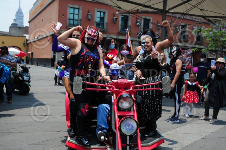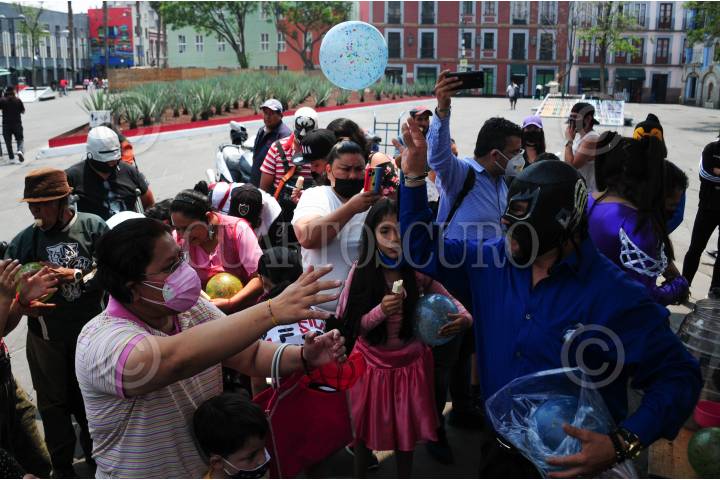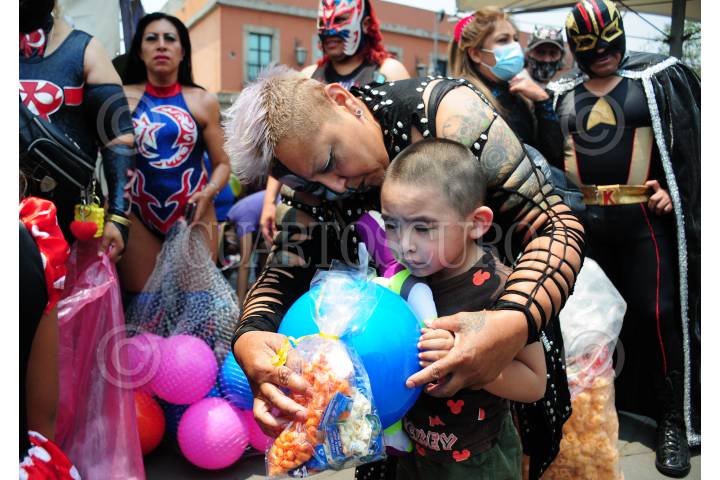 Una luchadora le entrega dulces y juguetes a un infante en la Plaza de Garibaldi.