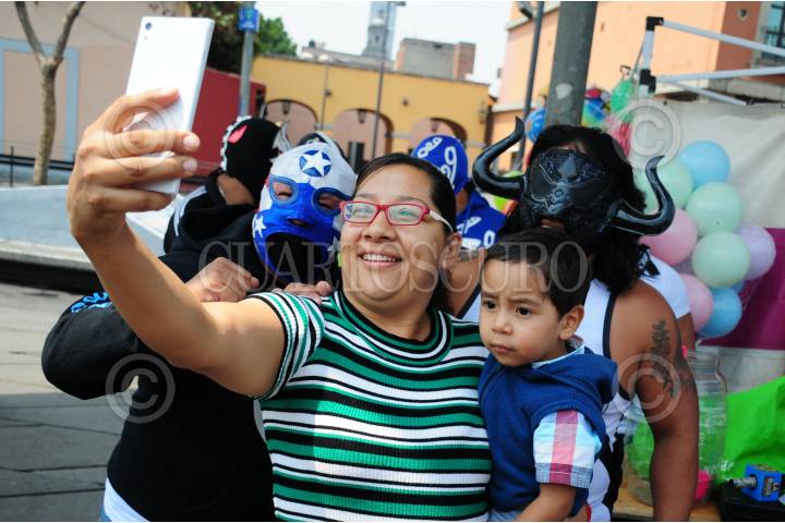 Una madre con su hijo en brazos se toma una fotografía con sus luchadores favoritos.