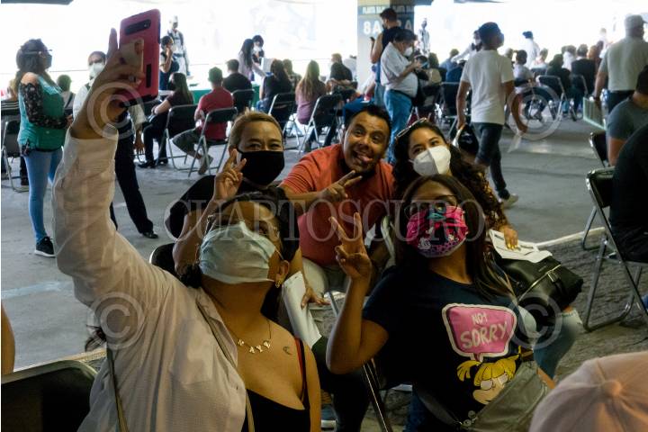 Cuatro mujeres y un hombre se toman una selfie previo a recibir la primer dosis de Sputnik V en la unidad de vacunación de la Arena Ciudad de México.