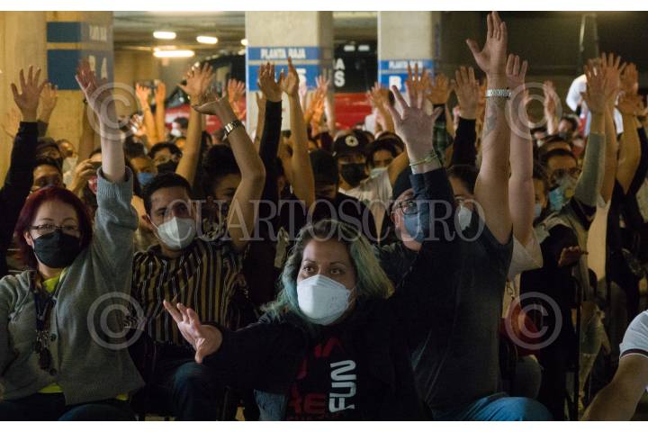 Hombres y mujeres de entre 30 a 39 años realizan la activación física tras recibir la primer dosis de Sputnik V en la unidad de vacunación de la Arena Ciudad de México.