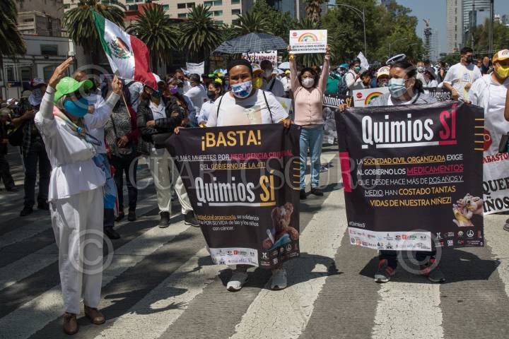 Rosa Areli Hernández (la ultima de izquierda a derecha), madre de Jonathan García Hernández, quien padeció el desabasto de medicamentos para tratar la leucemia que padece su hijo, durante la marcha denominada #QuímiosSí.