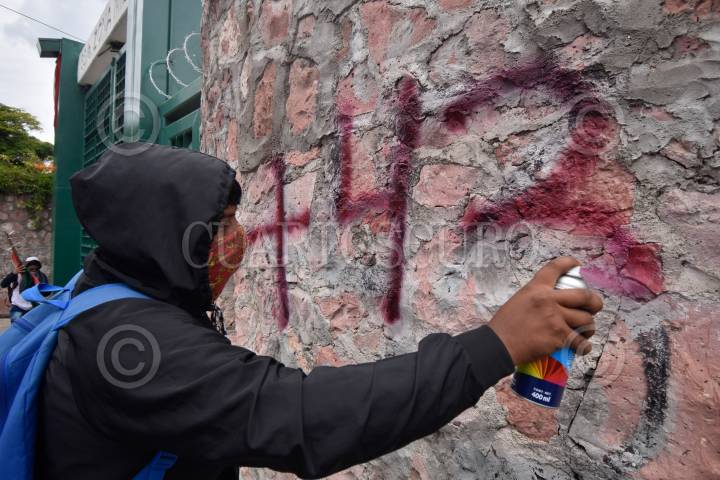 CHILPANCINGO, GUERRERO, 19FEBRERO2015.-Jóvenes encapuchados acudieron a la 35 zona militar, ubicada en el boulevard Vicente Guerrero, donde arrojaron piedras, cohetes e hicieron pintas en las barda perimetral con las leyendas “Ayotzinapa Vive” “Nos Faltan 43”, para exigir la presentación con vida de los 43 estudiantes desparecidos en Iguala. FOTO: JOSÉ I. HERNÁNDEZ / CUARTOSCURO.COM