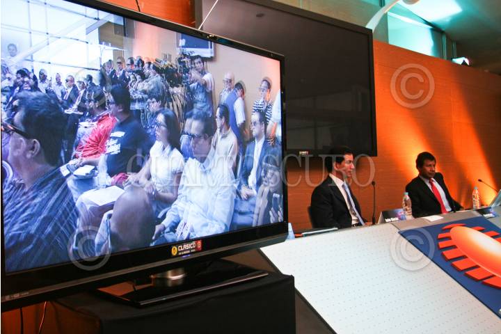 MÉXICO, D.F., 21OTCUBRE2009.- Javier Alarcon, director editorial de Televisa deportes junto a Elias Rodriguez, director general de operaciones de Televisa Chapultepec durante la conferencia de prensa que se dio para anunciar la transmisión del partido de fútbol, (América-Guadalajara) en Tercera Dimensión 3D. FOTO: ENRIQUE ORDÓÑEZ/CUARTOSCURO.COM