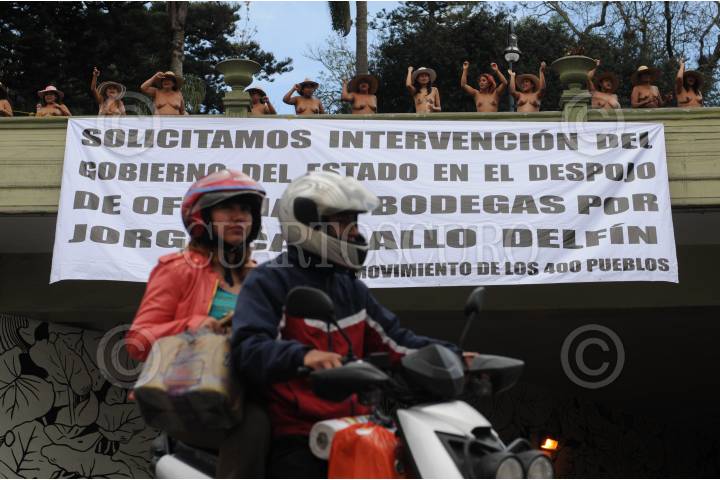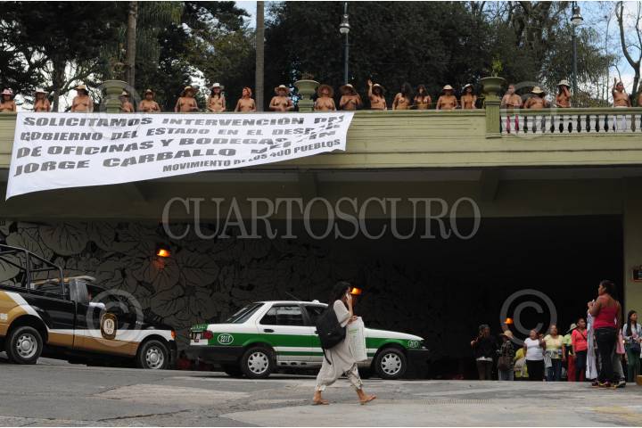 XALAPA, VERACRUZ, 17MARZO2015.-La asamblea de mujeres de los 400 pueblos realizaron una protesta con el torso desnudo sobre el parque Juárez y la biblioteca Carlos Fuentes, solicitando al Gobierno del Estado su intervención para recuperar unas bodegas en el municipio de Álamo-Temapache con una superficie de 24 mil 965 metros cuadrados de las cuales fueron despojadas por el Juzgado Segundo de Primera Instancia del Distrito Judicial de Tuxpan. Acusan al candidato a la diputación federal del Partido Revolucionario Institucional (PRI) Jorge Carballo Delfín de orquestar el despojo a través de un prestanombres llamado Albertano Palacios Hernández. FOTO: RUBÉN ESPINOSA /CUARTOSCURO.COM