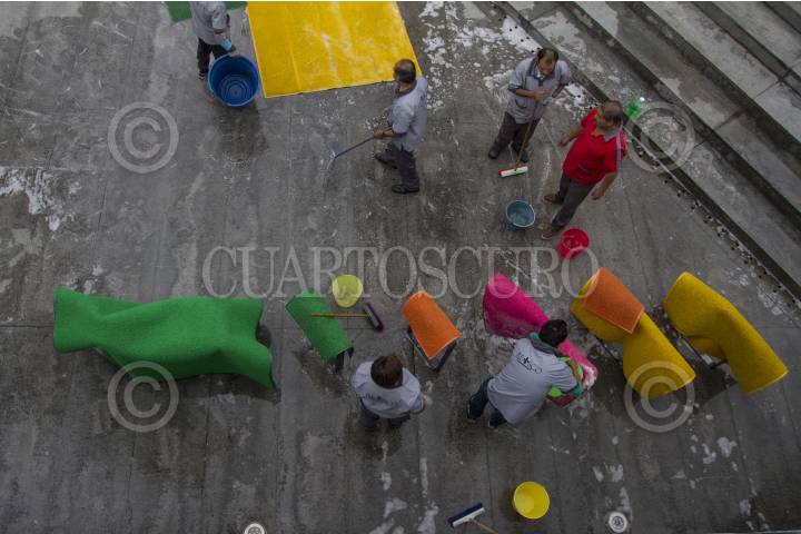 CIUDAD DE MÉXICO, 10NOVIEMBRE2016.- Trabajadores del Centro de Cultura Digital lavan los tapetes en la explanada de la Estela de Luz. FOTO: ISAAC ESQUIVEL /CUARTOSCURO.COM