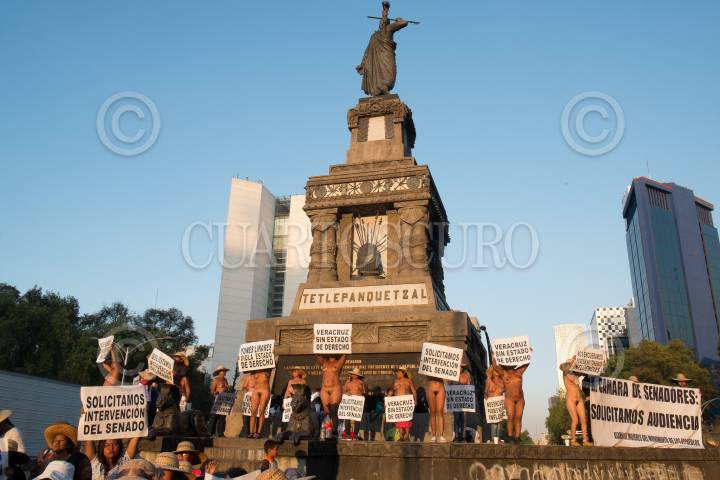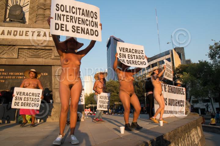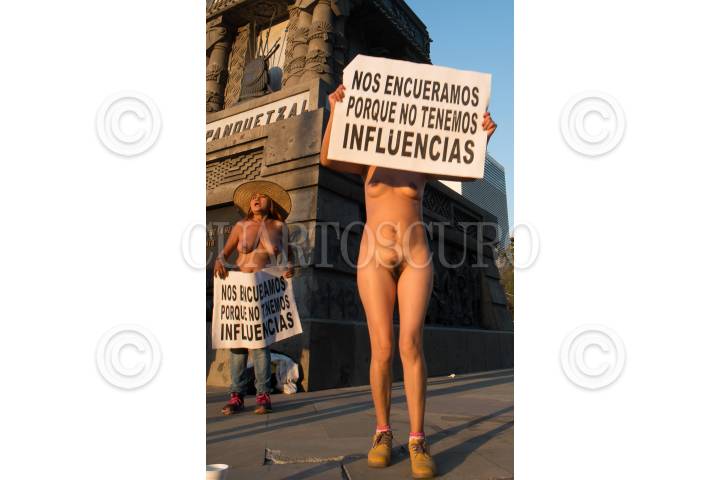 CIUDAD DE MÉXICO, 25NOVIEMBRE2017.- Integrantes de los 400 pueblos se manifestaron en el Monumento a Cuauhtémoc en Paseo de la Reforma. Como es costumbre en las protestas de la organización, al ritmo de la música los quejosos se quitaron la ropa para bailar y solicitar la atención de las autoridades. FOTO: ANDREA MURCIA /CUARTOSCURO.COMNo