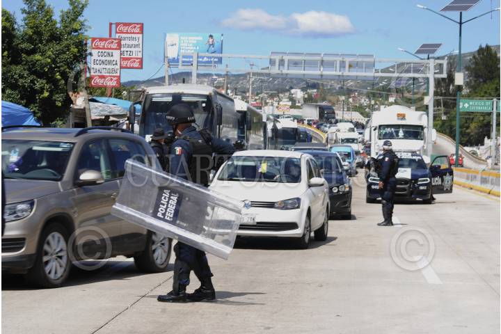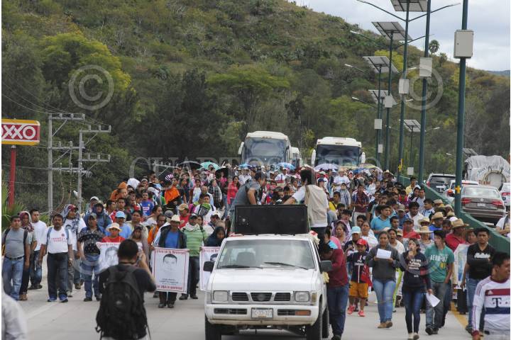 CHILPANCINGO, GUERRERO, 14 NOVIEMBRE 2015.- Contingente de manifestantes conformados por estudiantes de la normal rural Raúl Isidro Burgos de Ayotzinapa, padres de familia de los 43 jóvenes desaparecidos en Iguala y profesores de la Ceteg de la fracción de Ramos Reyes Guerrero llegaron apoyar el bloqueo, al lugar arribaron policías antimotines a dialogar con los manifestantes para liberar la arteria vehicular, quienes llegaron a un acuerdo y después de permanecer bloqueada la autopista por hora y media en el Parador del Marques el contingente emprendió una marcha de Sur – Norte con dirección al palacio de gobierno y hacer un mitin por la represión que sufrieron por parte de Zeferino Torreblanca en el sexenio que goberno y por el hechos suscitados en el libramiento de cuota Chilpancingo – Tixtla. FOTO: JOSÉ I. HERNÁNDEZ /CUARTOSCURO.COM