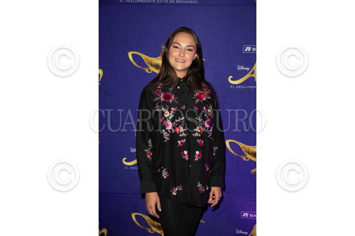 Jade Fraser durante la alfombra roja por las 450 representaciones del musical Aladdín, que se presenta en el Teatro Telcel.