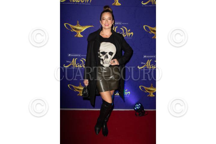 Andrea Torre durante la alfombra roja por las 450 representaciones del musical Aladdín, que se presenta en el Teatro Telcel.