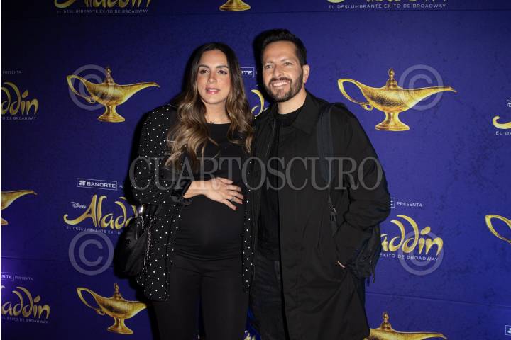 Juan Osorio y Eva Daniela durante la alfombra roja por las 450 representaciones del musical Aladdín, que se presenta en el Teatro Telcel.