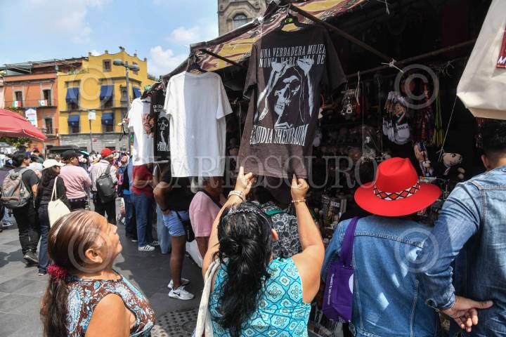 CIUDAD DE MÉXICO, 20SEPTIEMBRE2024.- Dos mujeres observan una playera de la santa muerte con la leyenda: "Una verdadera mujer nunca habla mal de Claudia Sheinbaum", exhibida en un puesto ambulante en las inmediaciones de Palacio Nacional. FOTO: MARIO JASSO/CUARTOSCURO.COM