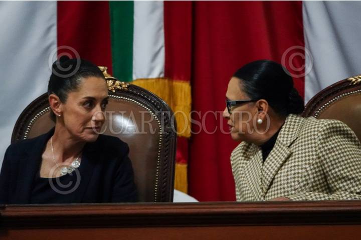 Claudia Sheinbaum conversa con Rosa Icela Rodríguez, secretaría de Seguridad Pública y Protección Ciudadana, durante la presentación del 4to informe de gobierno ante el Congreso de la CDMX.
