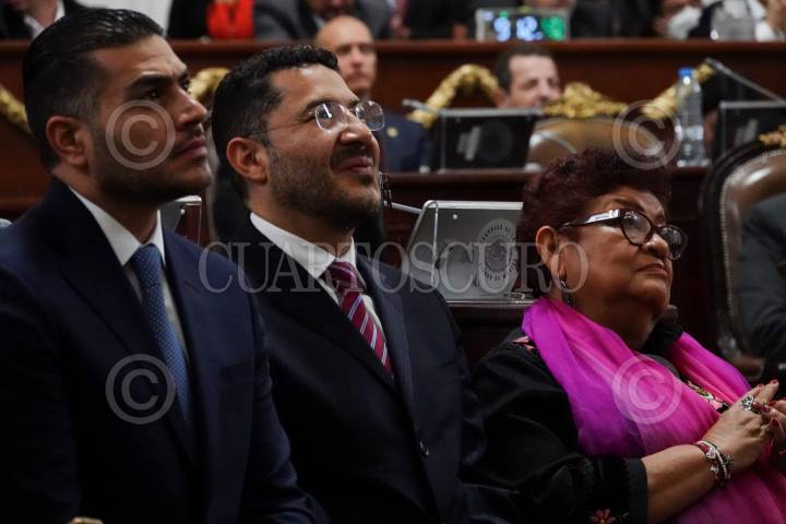 Omar García Harfuch, secretario de Seguridad capitalino, Martí Batres, secretario de gobierno de la ciudad, y Ernestina Godoy, fiscal capitalina, durante el 4to informe de Claudia Sheinbaum ante el Congreso de la CDMX.