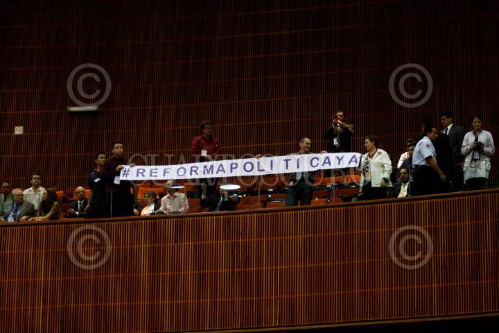 MÉXICO, D.F., 01SEPTIEMBRE2011.- La organización Reforma Politica Ya se manifestaron con una pancarta desde la parte superior de la Cámara de Diputados durante la sesión de Congreso General en donde José Francisco Blake Mora, secretario de Gobernación entrego el 5to Informe de Gobierno del presidente Felipe Calderón ante legisladores. FOTO: RODOLFO ANGULO/CUARTOSCURO.COM