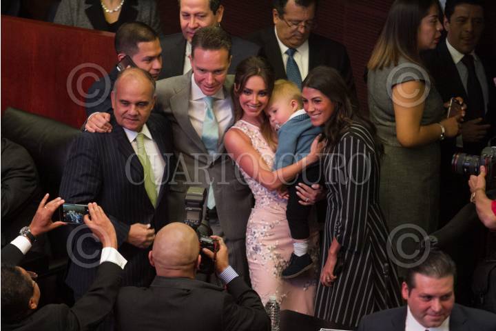 CIUDAD DE MÉXICO, 29AGOSTO2018.- Manuel Velasco Coello, senador del PVEM, y su esposa Anahí, quien carga a su hijo, se toman la foto con los priistas Manuel Añorve y Silvana Beltrones, en la sesión de apertura de los trabajos de la 64 Legislatura en la Cámara de Senadores. FOTO: MOISÉS PABLO /CUARTOSCURO.COM