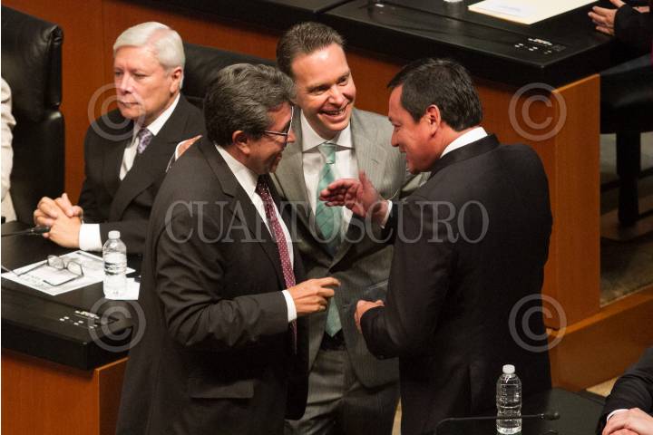 CIUDAD DE MÉXICO, 29AGOSTO2018.- Los senadores Ricardo Monreal (Morena; Manuel Velasco Coello (PVEM), y Miguel Ángel Osorio Chong (PRI), durante la sesión de apertura de los trabajos parlamentarios de la 64 Legislatura en la Cámara de Senadores, en donde tomaron protesta al cargo. FOTO: MOISÉS PABLO /CUARTOSCURO.COM