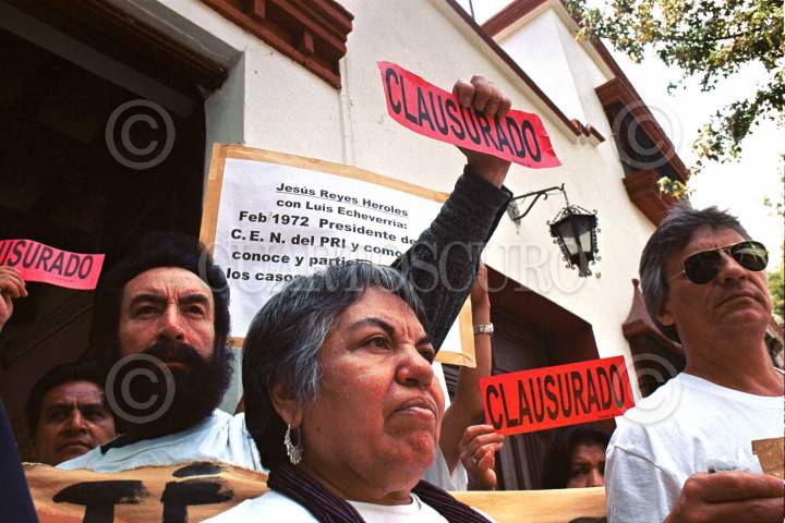 El grupo"Comité del 68" clausuraron de manera simbolica el Centro Cultural Jesús Reyes Heroles, para manifestarse que no es merecido que el ex secretrio de eduacación, forme parte de la rotonda de hombres ilustres, a causa de ser un supuesto complice de la matanza estudiantil de 1968. FOTO: Eunice Adorno/CUARTOSCURO.COM