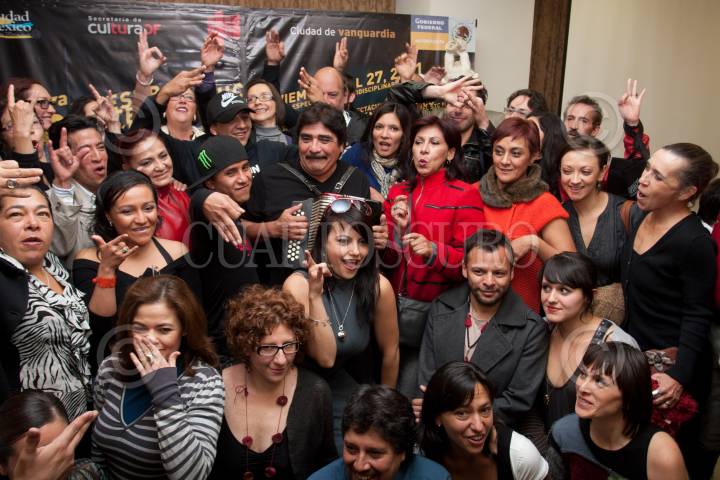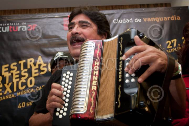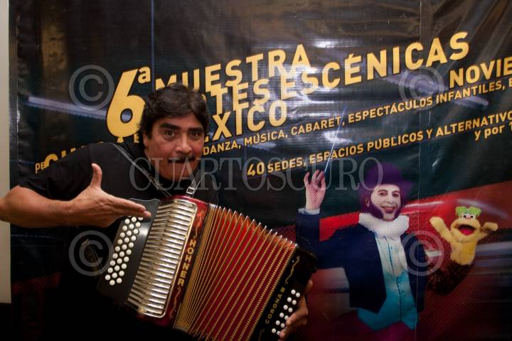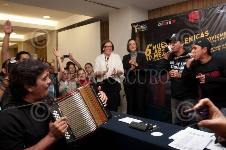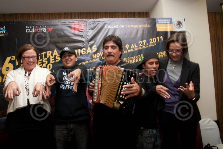 MÉXICO, D.F., 26OCTUBRE2011.- El cantante regiomontano, Celso Piña, María Elena Cepeda, titular de la Secretaria de cultura del D.F. Nina Serrano, Coordinadora del Sistema de Teatros y Mario de la Rosa Guillen y Cuatin Iván Jaire Ruiz integrantes de “El Poder del Barrio” dieron a conocer los pormenores del 6o. Festival de las Artes Escénicas de la Ciudad de México, que será inaugurado el próximo 9 de Noviembre con la presentación del cantante regio en el teatro de la Ciudad Esperanza Iris. FOTO: GUILLERMO PEREA/CUARTOSCURO.COM
